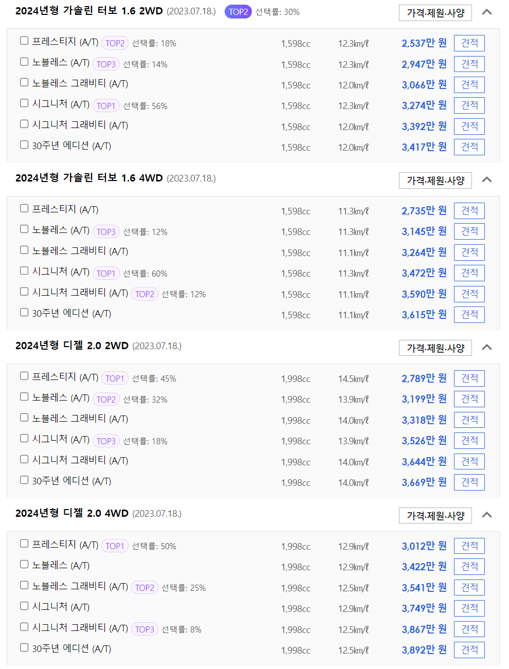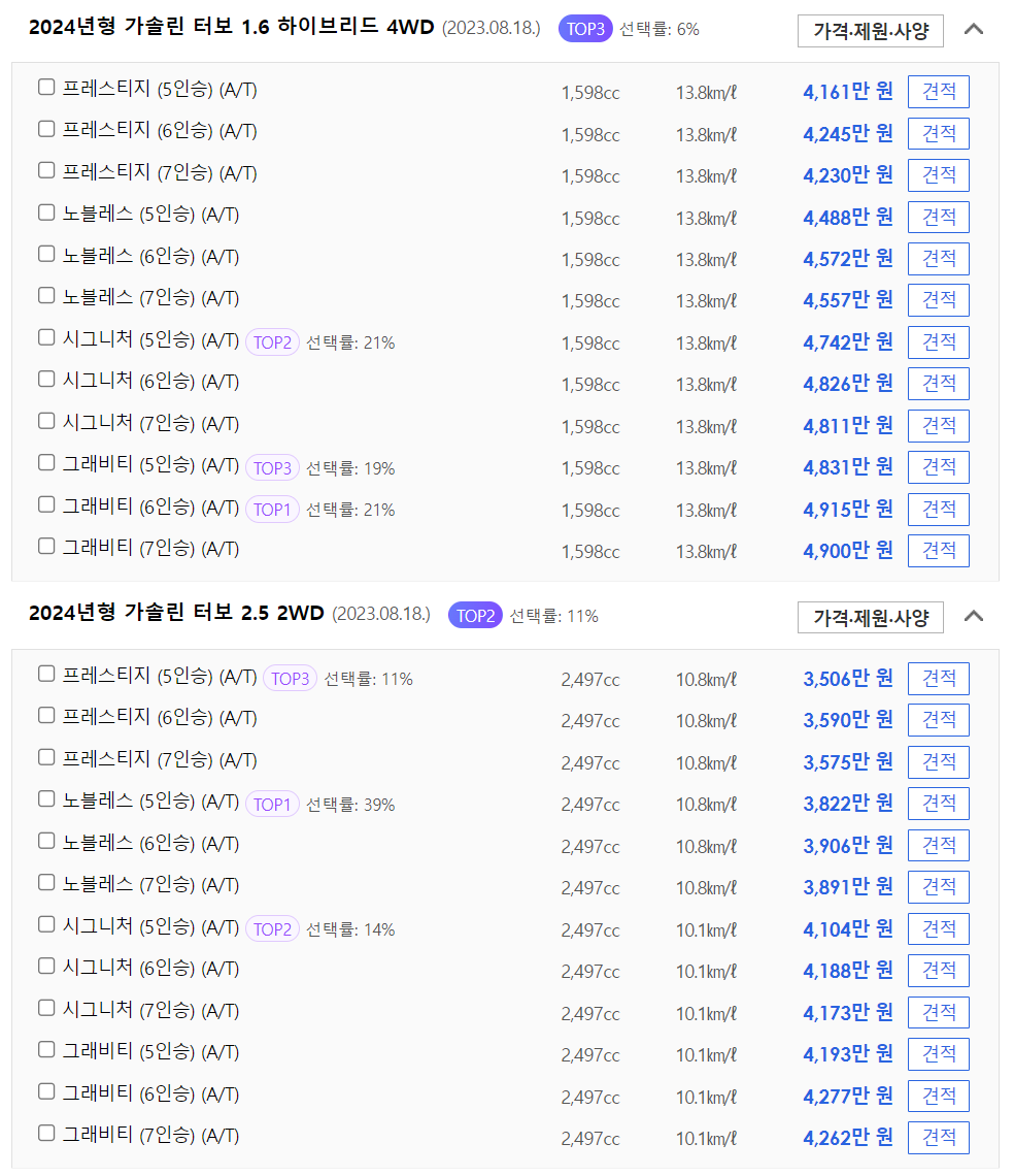 | 모델명 | 크기 | 연료 | 연비 | 가격 |
