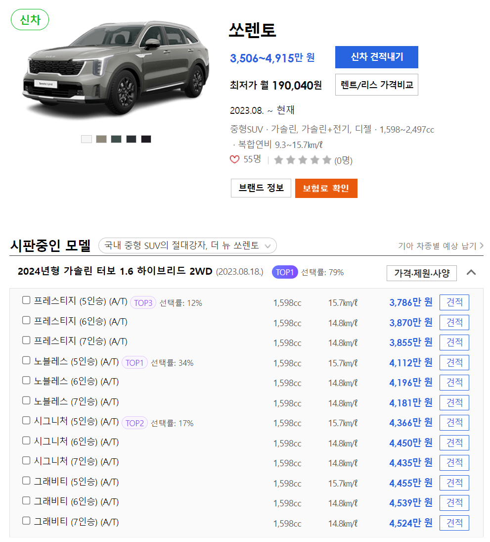 | 중형 SUV | 쏘렌토 | 3,506 만원 ~ |