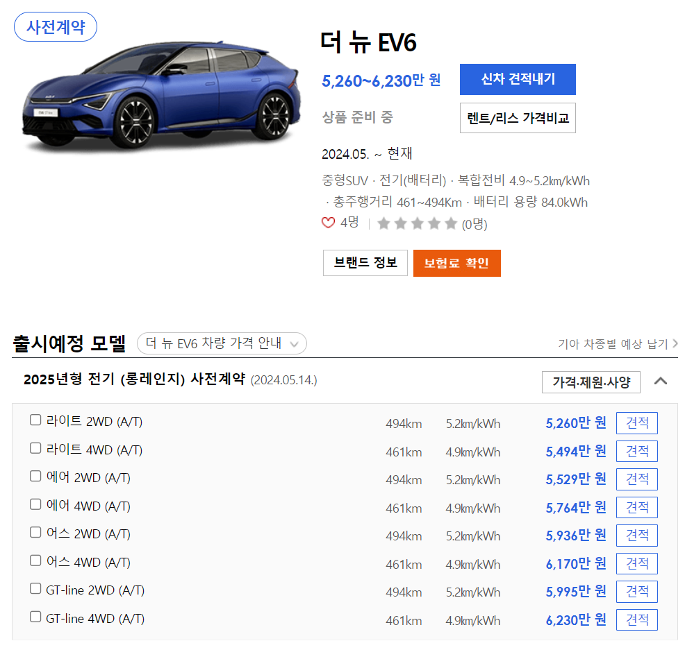| 전기차 | EV6 | 5,540 만원 ~ |