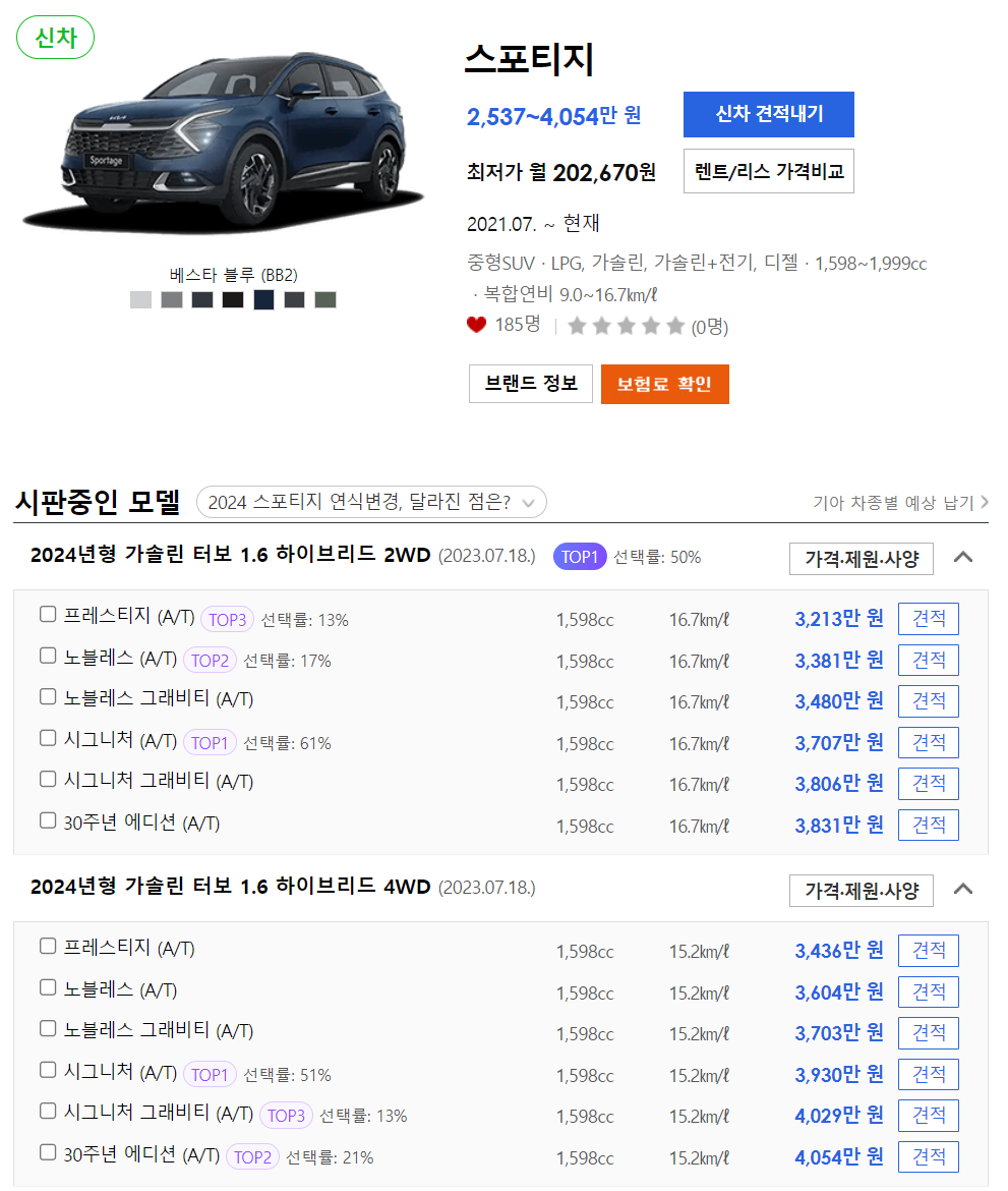 기아 준중형 SUV 스포티지입니다. 2024년형 스포티지 가격은 2,537~4,054만 원입니다. 스포티지 가솔린의 신차 가격은 2537~3615만 원, 스포티지 하이브리드 가격은 3213~4054만 원, 스포티지 LPG 가격은 2601~3481만 원입니다.