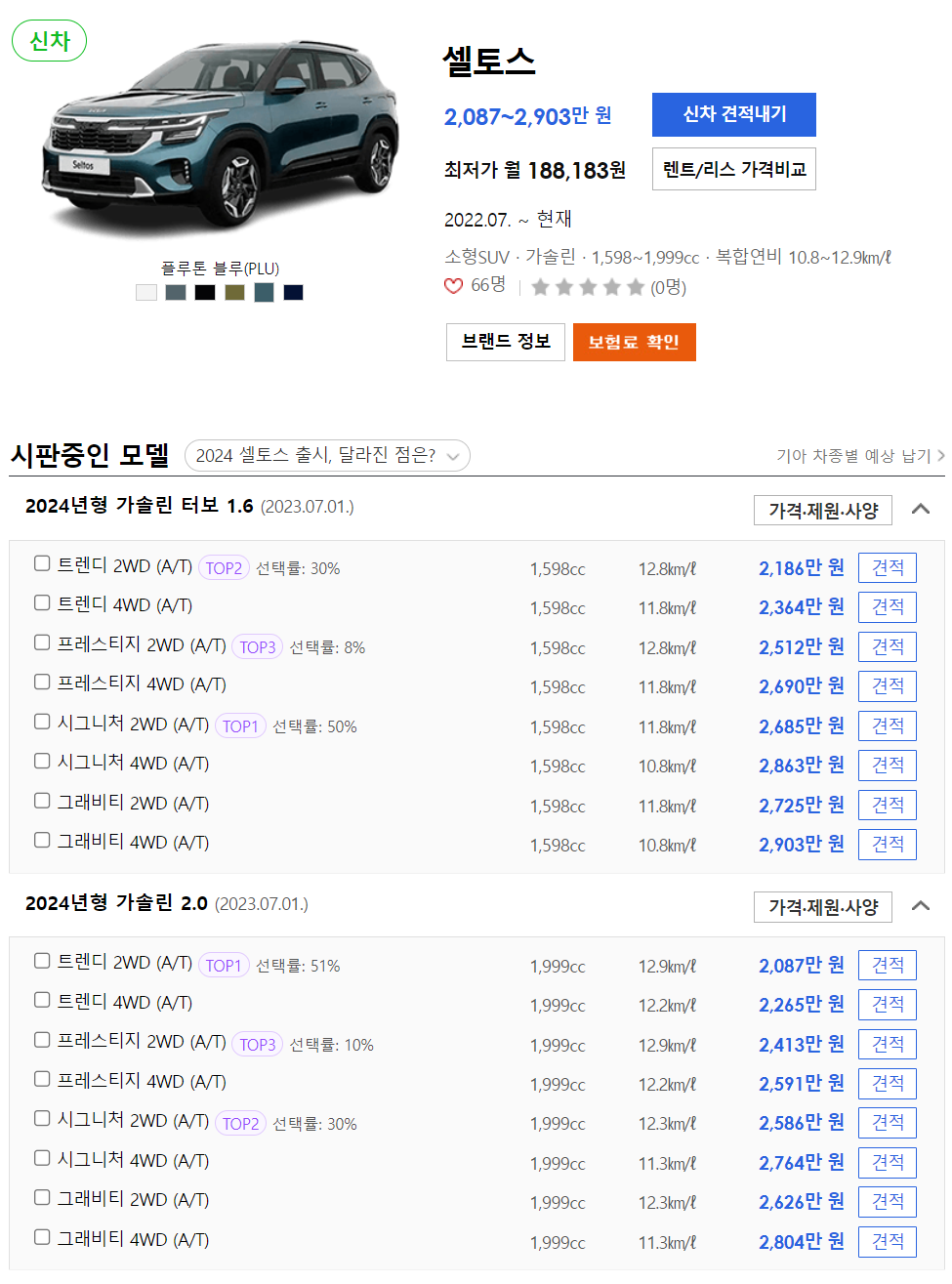 | 컴팩트 SUV | 셀토스 | 2,087 만원 ~ |